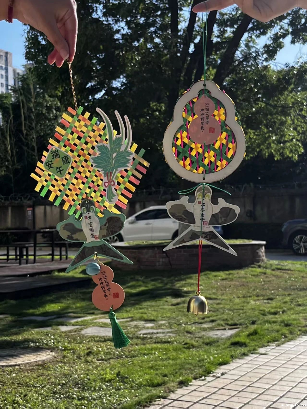 在非遗手工端午活动现场,同学们将干花巧妙地镶嵌在团扇上,创作出一幅幅精美的艺术作品,用竹条编织出小巧玲珑的挂饰,感受传统竹编工艺的魅力,同学们发挥奇思妙想,用黏土塑造出与端午时节相关的节气场景,将传统文化与现代创意完美融合。