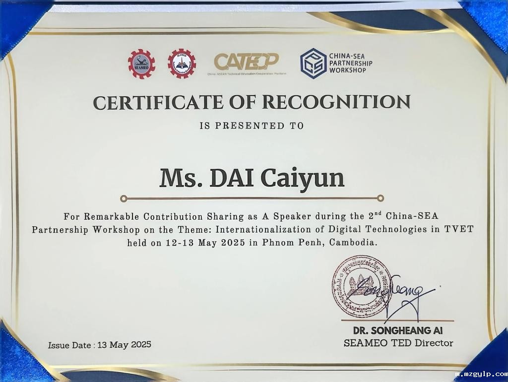会议上,戴彩云在“技术教育与工业4.0结合”主题论坛中发表题为《数智时代,构建技术技能人才培养新生态》的专题演讲。她结合我校在产教融合、课程改革及数字化教学中的实践案例,系统阐述了职业教育对接工业4.0的思路与探索,得到东南亚多国教育界代表的关注与肯定,并获此次峰会最高个人荣誉——“杰出贡献奖”,并因推动校企合作与项目管理创新获颁“优秀项目管理奖”。